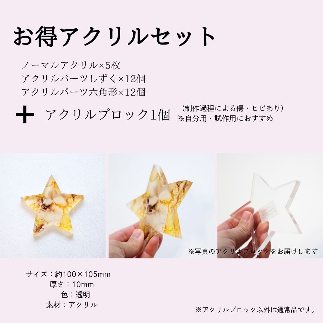 制作練習や試作など、自分用に気軽に使っていただけるお得なアクリルセットです。