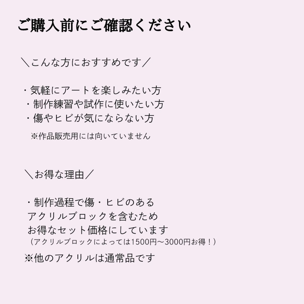 本来はアクリルブロックを含まないセット価格に、制作過程で傷・ヒビのあるアクリルブロックを1点お付けしています。